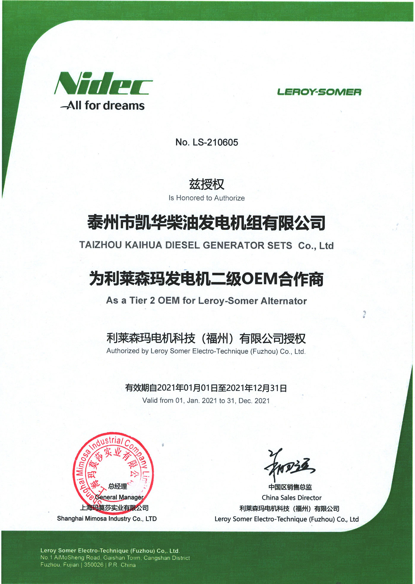 泰州市凱華柴油發電機組有限公司創建于2003年,是一家集柴油發電機組的研發、生產、銷售為一體的高新技術民營企業,公司目前注冊資本金11800萬元人民幣,生產基地占地六十畝,現有各類高素質員工一百多名,專業技術人員達46人,其中高級技術人員16人,年銷售額近6億元。公司主營產品:3~3000KW陸用柴油發電機組,15~600KW移動拖車電站,12~1000KW船用應急柴油發電機組,各種靜音型、中高壓、多機并聯、燃氣等特種機組以及進口系列柴油發電機組,可滿足不同客戶的不同電力需求,還可滿足用戶不同電壓、不同頻率的要求。